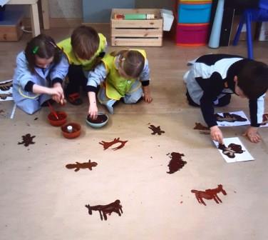 Todo ello nos provocó muchísima curiosidad y nos llevó a preguntarnos cómo y dónde vivían, cómo cazaban, qué comían, cómo vestían… Así que decidimos traer al Espacio Proyecto libros e investigaciones para poder conocer y aprender más cosas acerca de la vida en la Prehistoria. Como todo este aprendizaje nos emocionó muchísimo quisimos traer esta época a clase y transformamos el espacio en una cueva en la que, con nuestras manitas de artistazos, llenamos de pinturas rupestres. Esta transformación no habría sido posible sin la participación de las familias, ya que nos ayudaron con la elaboración del material que hizo posible todo esto: la creación de herramientas de época, fuegos, animales… y así hemos disfrutado enormemente al jugar a ser cavernícolas.